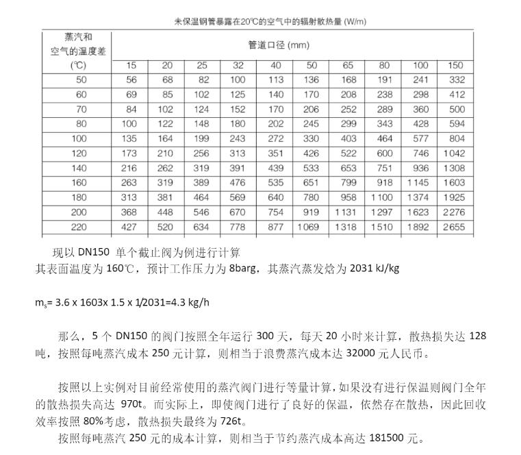 輪胎橡膠、玻璃制品等這些行業(yè)中,蒸汽的能耗降低是企業(yè)競(jìng)爭(zhēng)優(yōu)勢(shì)之一,有時(shí)蒸汽控制的好壞還會(huì)影響生產(chǎn)效率和產(chǎn)品的品質(zhì)。蒸汽閥門的散熱問(wèn)題是很嚴(yán)重的,我們通過(guò)以下公式可以計(jì)算