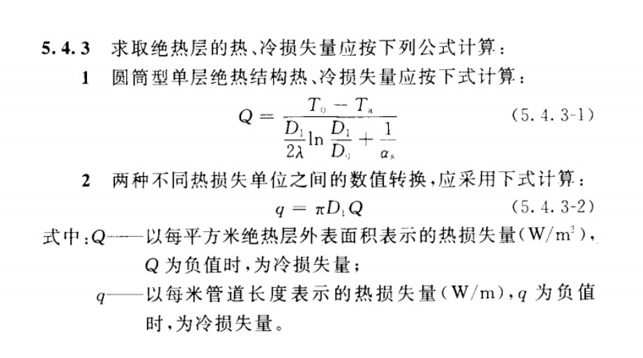 在國標文件《工業設備及管道絕熱工程設計規范 GB50264-2013》中,規定了圓筒形單層絕熱結構熱、冷損失量計算公式: