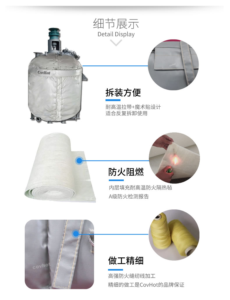 工業罐體保溫套無需專業保溫人員,無需專業培訓,操作簡單快速,表層纖維布不含石棉成分,防油、防水性能優良,無纖維飛散問題,環保、安全、衛生。隔熱保溫效果佳,耐溫可達1170度。具有易操作,節省維護時間和保溫成本。光澤、平整、美觀、使用壽命長、防雨、防酸堿、抗老化,柔軟,拆卸方便,重復使用,節能環保。解決了經常拆卸部位難以重新保溫的問題,減少了能源浪費。